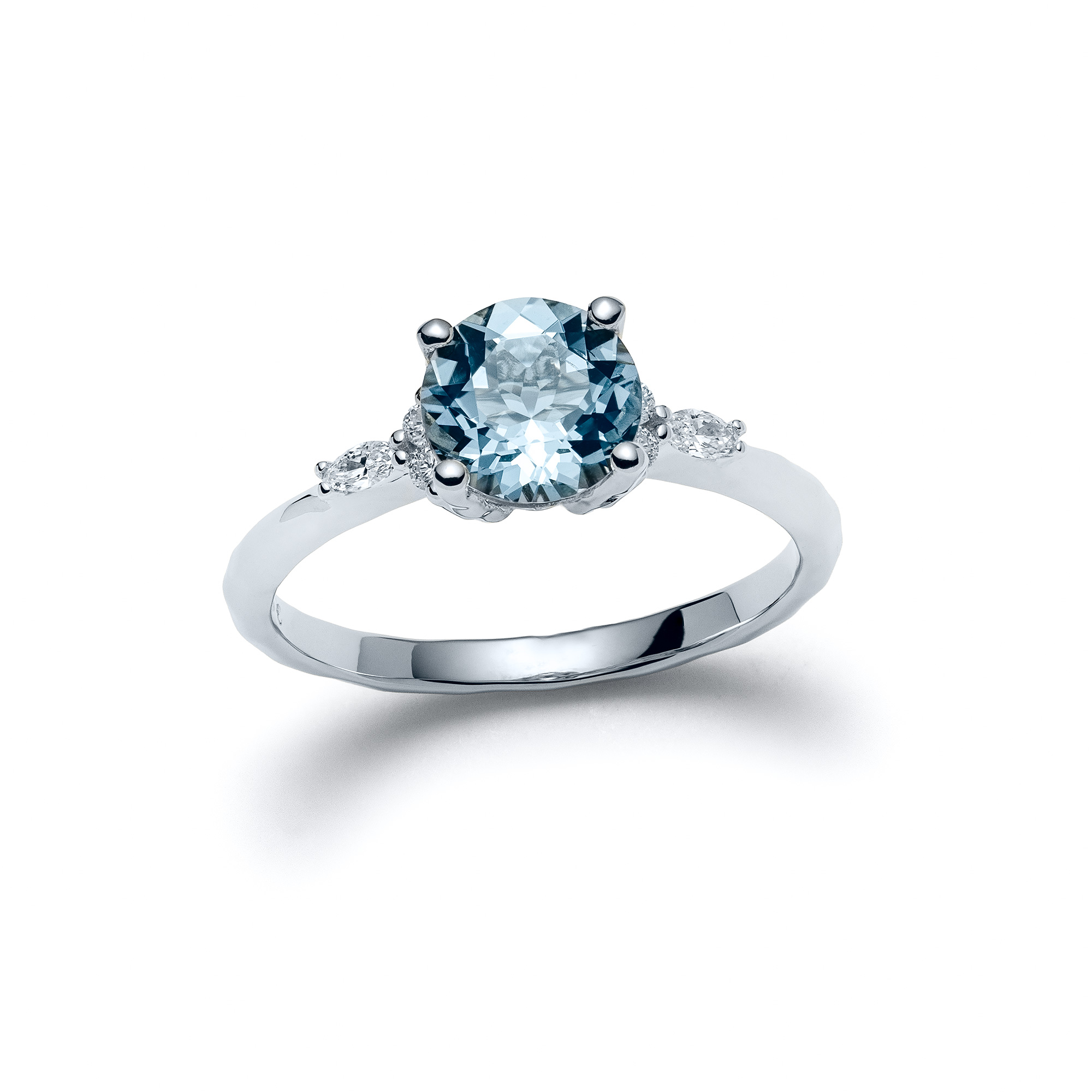 This modern, ready-to-ship Aquamarine & Diamond ring features a prong-set Aquamarine gemstone selected with care by the gallery’s master stone buyer.